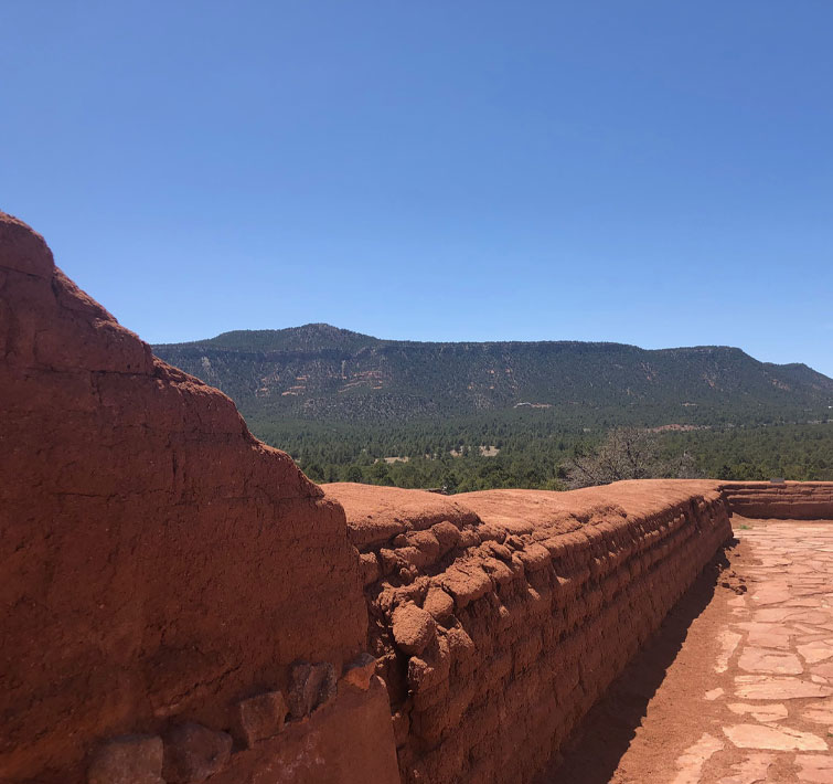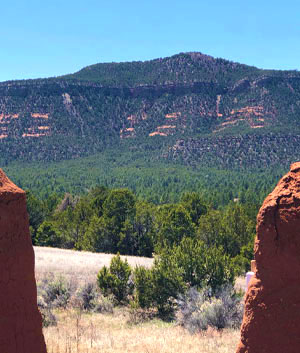 The hundreds of Pueblo Indians long occupying the Pecos River site, and the indigenous settlements which preceded theirs, looked up to the prominent Crystal Mesa features overlooking their communities. It is thought that these peoples journeyed to the top of this nearby Crystal Mesa, including for ritual and ceremony. Aerial photos of the Mesa reveal a 700’ diameter circular line among the trees, suggesting some ancient prior stonework may have once defined an area of special significance.