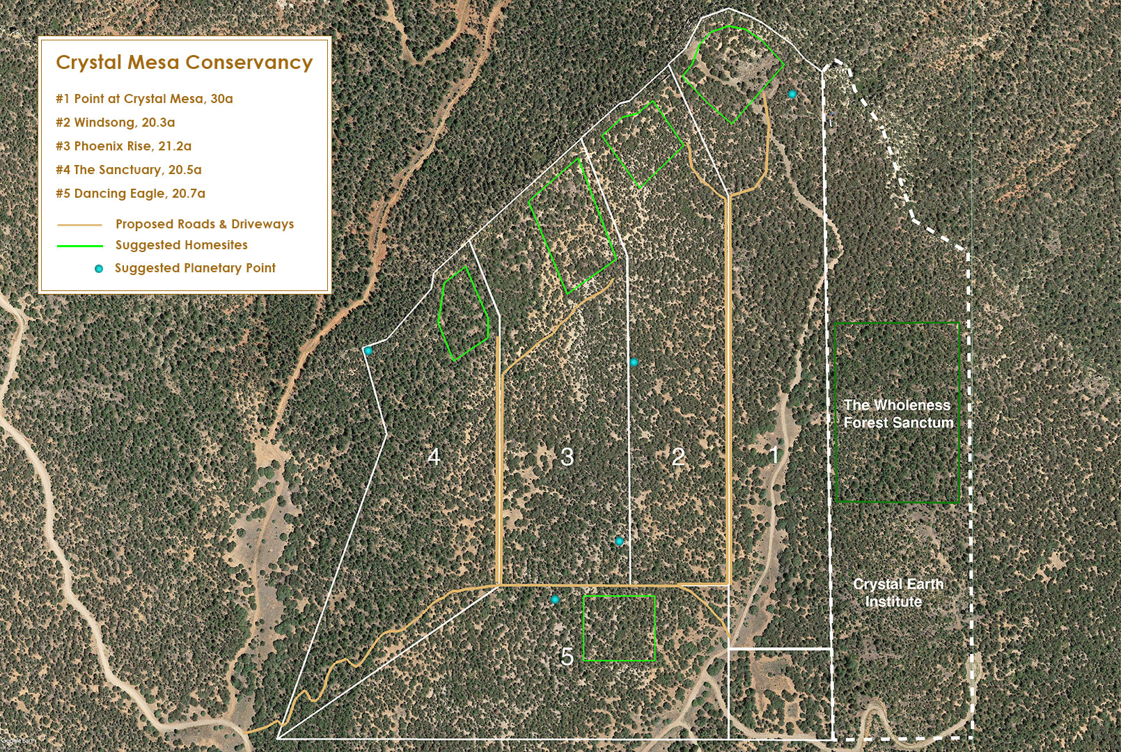 Owners and their guests enjoy the use of private nature trails both within the Conservancy and through adjoining scenic greenbelt areas. Conservancy owners will also have the opportunity for guest access to the adjoining Crystal Earth Institute campus, with its unique installations and ceremonial enclaves. Additionally, each Estate Preserve includes one or more mapped “Planetary Points” where the owner may consider installation of suggested features to enhance the experience of the rare energies of Crystal Mesa.